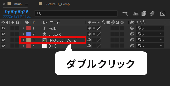 ダブルクリックすると、プリコンポーズ内が開きます。
