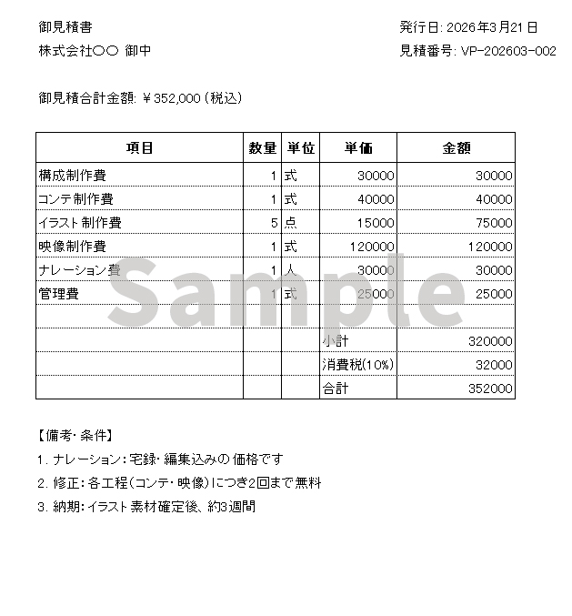 - 備考欄:事前に決めた「仕様」や、支払い条件を記載