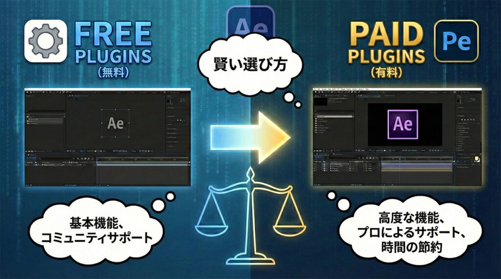 無料版の After Effects プラグインと有料版では、選ぶ際の「視点」が根本的に異なります。